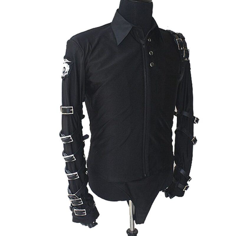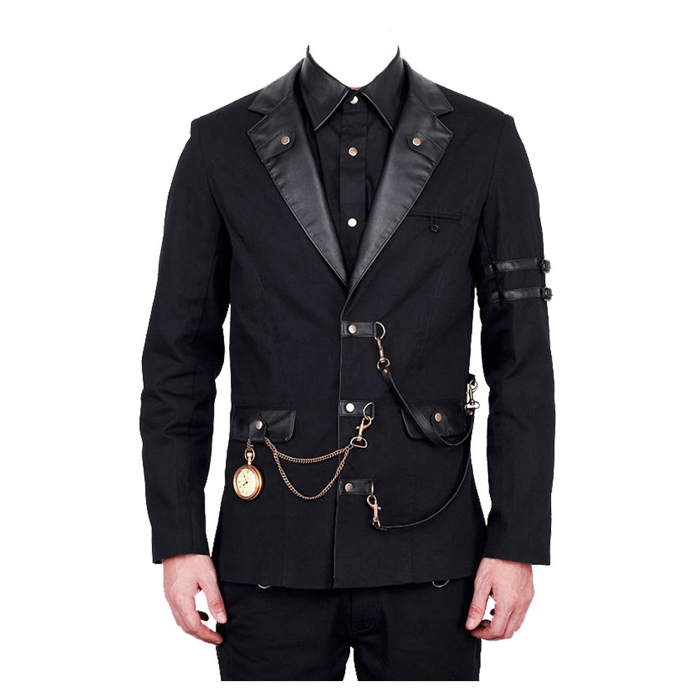 Command attention and embrace industrial elegance with this Leather Lapel Gothic Military Jacket—a bold fusion of formal tailoring and dark, Victorian-inspired edge. This striking black blazer features dramatic faux leather peak lapels and a distinctive triple-buckle front closure that sets it apart from conventional formalwear. Accented with a decorative hanging chain and adjustable sleeve straps, this piece channels a sophisticated Victorian mechanic vibe, perfect for those who dare to stand out.