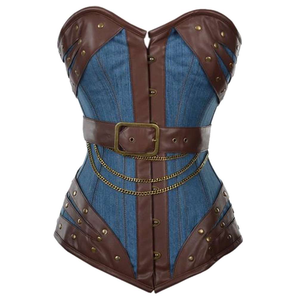 Overbust Denim Corset Women | Gothic Steampunk Corset with Faux Leather Strips