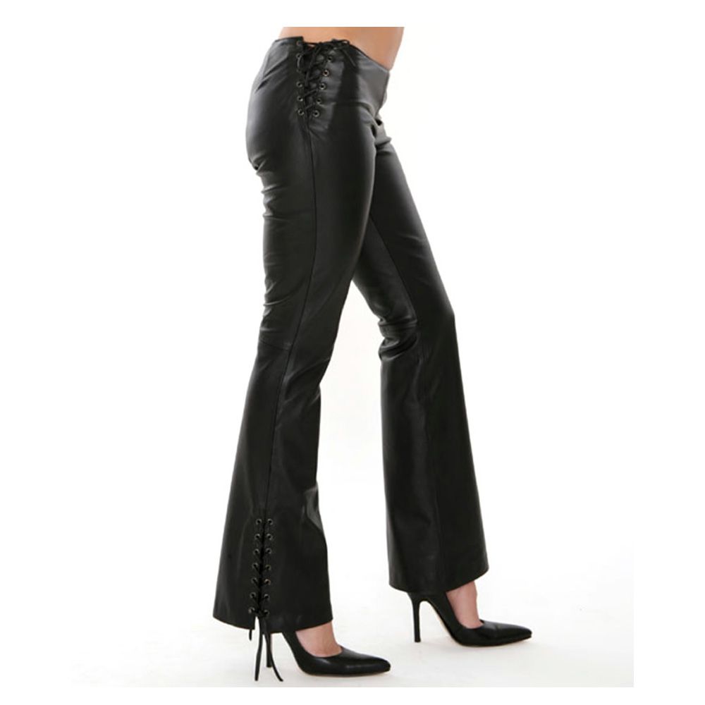 Casual yet comfortable. These slimming leather pants, feature lace on either side of the hip, back zipper fly closure, and are low waisted allowing you to show off your best features while at the same time feel and look comfortable.