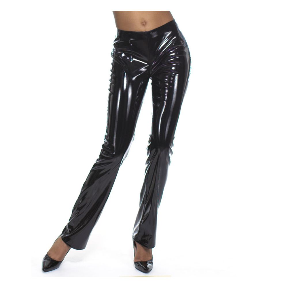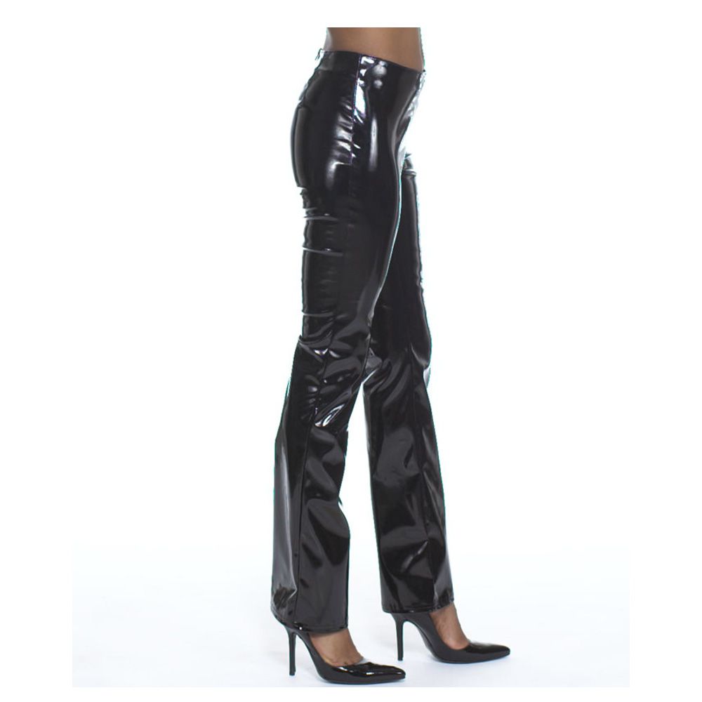 Shiny PVC low rise boot cut pants (Not Shown) Similar to picture but no belt hoops, No waistband with back zipper closure.