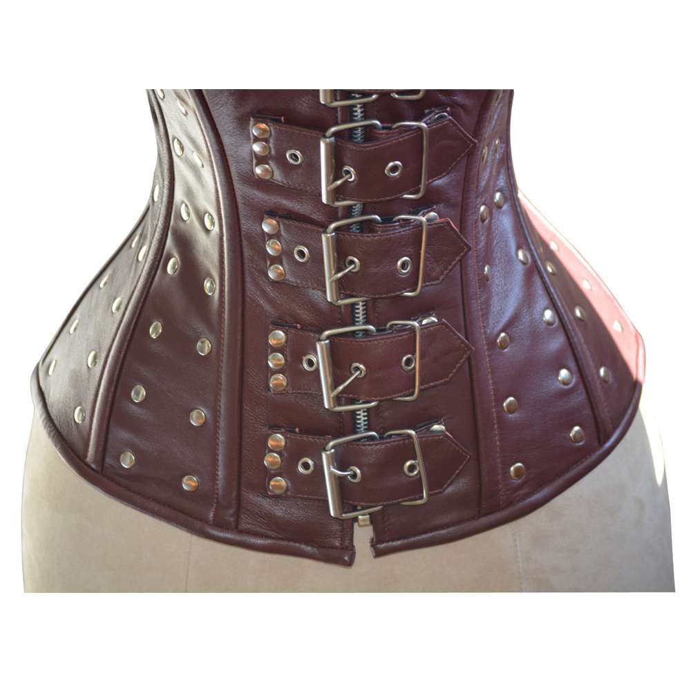 Design: Full-bust with metal décor and leather belt accents